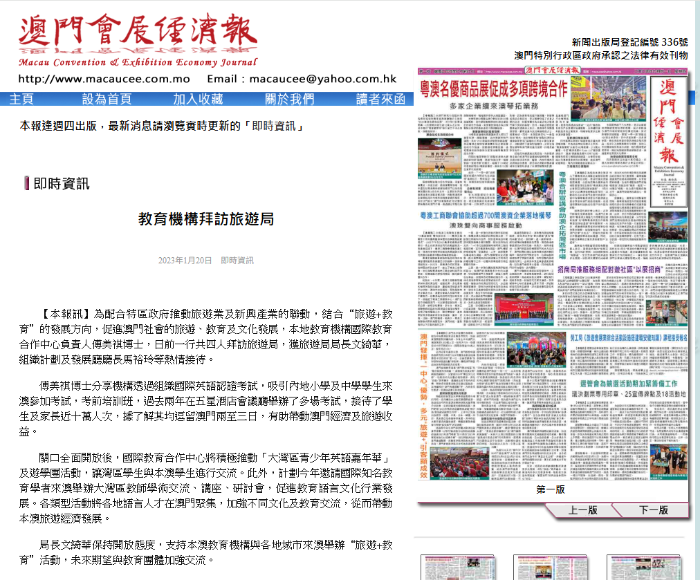 傅美褀博士分享機構透過組織國際英語認證考試,吸引內地小學及中學學生來澳參加考試,考前培訓班,過去兩年在五星酒店會議廳舉辦了多場考試,接待了學生及家長近十萬人次,據了解其均逗留澳門兩至三日,有助帶動澳門經濟及旅遊收益。