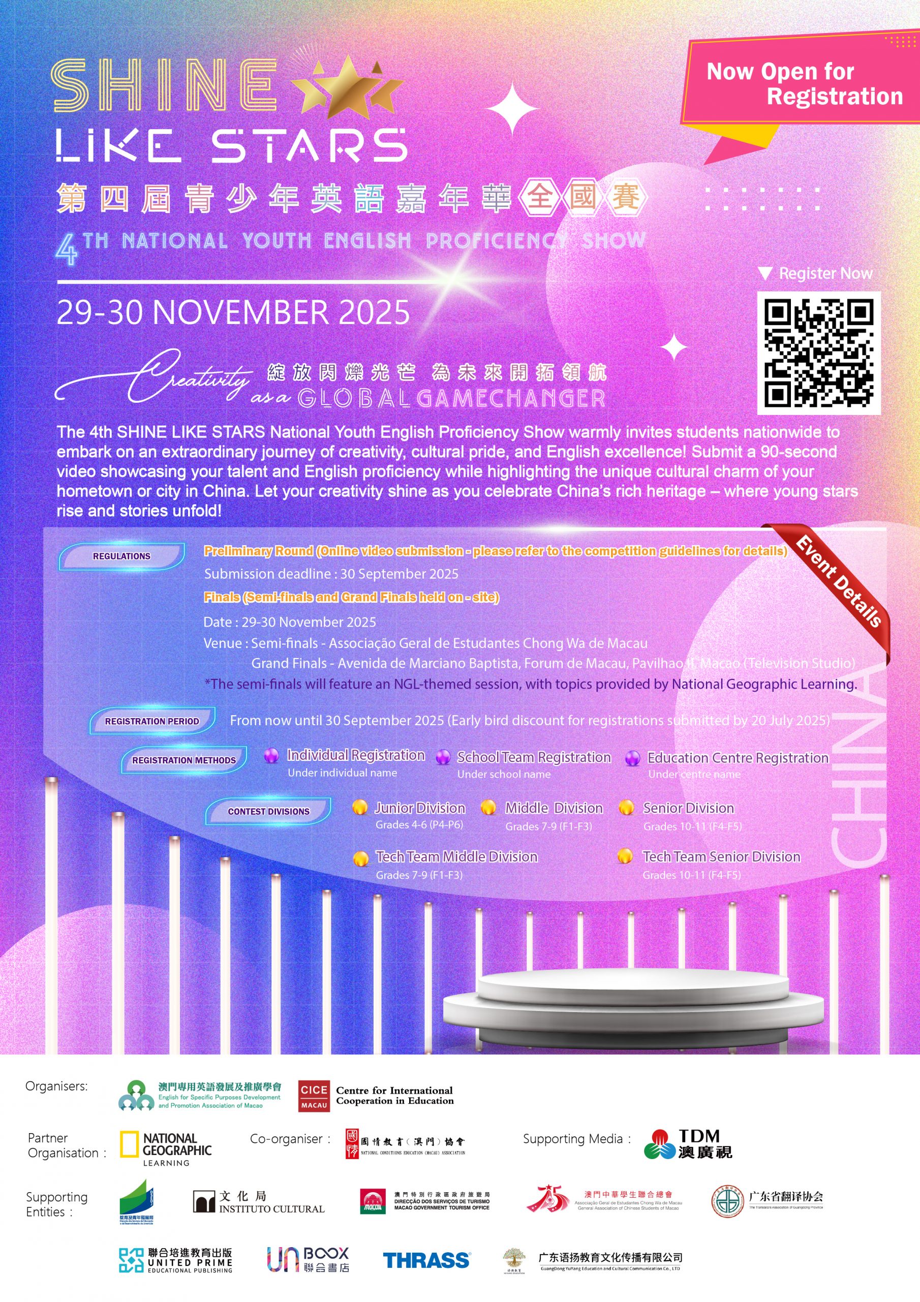 The 4th SHINE LIKE STARS National Youth English Proficiency Show Finals (hereinafter referred to as “SHINE LIKE STARS”), organised by the English for Specific Purposes Development and Promotion Association of Macao and CICE MACAU (Centre for International Cooperation in Education), jointly partnered with National Geographic Learning, co-organised by the National Conditions Education (Macau) Association, with TDM-Teledifusão de Macau, S.A. as the official media partner, and supported by the Education and Youth Development Bureau of the Macao Special Administrative Region Government, the Cultural Affairs Bureau of Macao, the Macao Government Tourism Office, the Associação Geral de Estudantes Chong Wa de Macau, The Translators Association of Guangdong Province, United Prime Educational Publishing (HK) Limited, Shenzhen Youri New Culture Co, Ltd., THRASS and Guangdong Yu Yang Education and Cultural Communication Co., LTD, will hold its Semi-Finals at the Associação Geral de Estudantes Chong Wa de Macau on 29 November 2025, followed by the Grand Finals at Avenida de Marciano Baptista, Forum de Macau, Pavilhao II, Macao (Television Studio) on 30 November 2025.