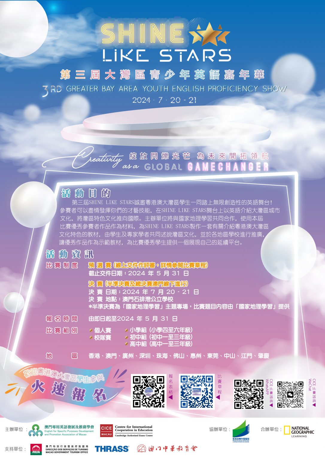 由澳門專用英語發展及推廣學會CICE MACAU (國際教育合作中心)主辦、澳門教育及青年發展局協辦、國家地理學習 (NATIONAL GEOGRAPHIC LEARNING)合辦、澳門特別行政區政府旅遊局、THRASS以及澳門中華教育會支持之「第三屆 SHINE LIKE STARS 大灣區青少年英語嘉年華」(下稱“SHINE LIKE STARS”)將於2024年7月20-21日假澳門石排灣公立學校禮堂進行總決賽。